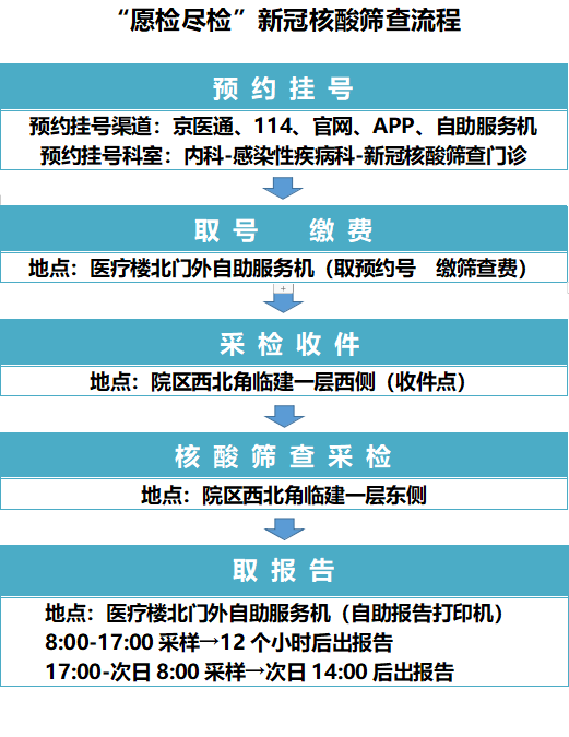 疫情防控工作进入常态化以后,北京清华长庚医院将继续开放核酸筛查门诊,提供充足号源,“愿检尽检”的民众可提前预约新冠核酸筛查门诊号源,预约及筛查流程如下:
