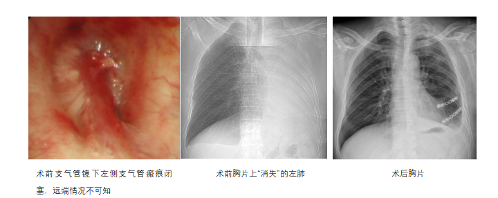 在胸部增强CT检查下,显示患者的左肺不仅不通气,还存在无效的血液分流,这加剧了全身缺氧的情况。此时,老张的血氧分压仅有74mmHg,如果不及时治疗,老张将面临持续缺氧、反复肺部感染等一系列问题,无法重拾劳作能力。此时摆在面前的治疗方案有两个,一是直接切除不张的左全肺,通过减少分流来缓解缺氧症状,此方案手术直接,但患者将完全失去一侧肺,仍可能面临活动耐受差的问题;另一种是通过修复重建支气管,恢复正常的肺通气,尽力找回他消失的左肺。此时距离老张外伤已有半月余,他甚至已代偿性地出现了胸廓塌陷、纵隔偏移等,再加上对于支气管损伤情况、胸腔粘连程度等的未知,都预示着手术的可操作性不确切、难度大、效果未知。