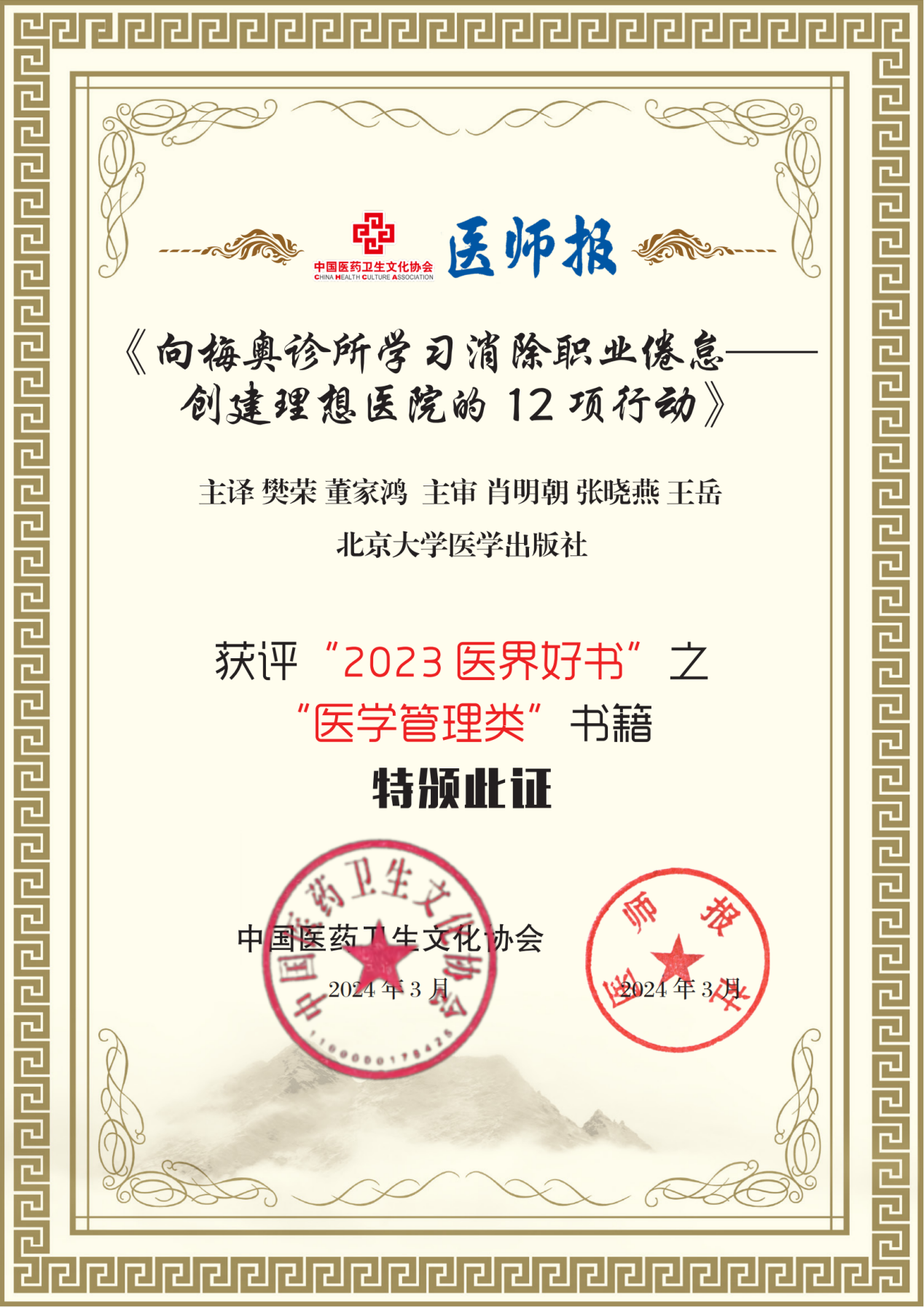 北京清华长庚医院3月27日电 (通讯员 韩冬野 万恒易) 3月21日,由《医师报》社、中国医药卫生文化协会、中国医药卫生事业发展基金会共同主办,第九届医学家年会在北京召开。清华大学附属北京清华长庚医院耳鼻咽喉头颈外科主任叶京英获“十大医学影响力专家”称号,宣传中心副主任韩冬野获“2023年度优秀特约通讯员”称号,由医患办负责人樊荣、院长董家鸿院士共同主译的书籍《向梅奥诊所学向梅奥诊所学习消除职业倦怠——创建理想医院的12项行动》一书获评“2023医界好书”之“医学管理类书籍”荣誉,神经中心主任王贵怀教授担任主编的《脊髓肿瘤外科学》获评“2023医界好书”之“医学学科类书籍”荣誉。