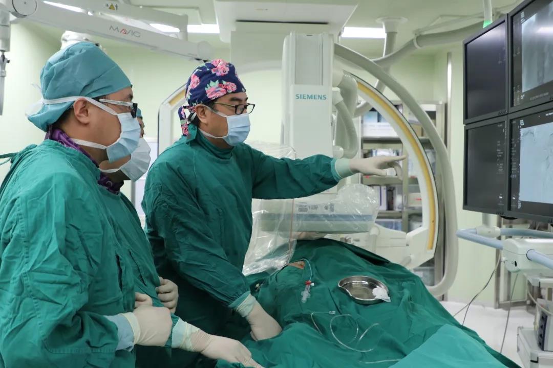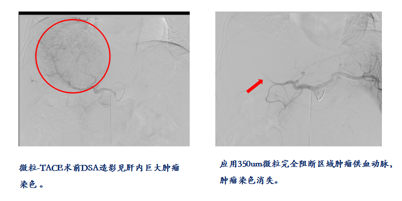 经过精心、细致的介入术前准备,张跃伟经股动脉建立到肝动脉的血管路径,在大型数字减影机的透视引导下注射造影剂,准确判断肿瘤供血动脉的来源、数量、直径,选择合适型号的栓塞剂。由于患者的肿瘤巨大,四周缠绕密布着大大小小的供血血管,介入医生此时需要非常精准地找到所有供血血管,使用混合一定量治疗药物的微粒型栓塞剂,一粒一粒地注射到肿瘤供血动脉内,直至其抵达供血动脉最末梢血管,再顺着整条通道一点点填满,致密栓塞后彻底阻断肿瘤供血来源。“形象讲就是通过掐断肿瘤供血动脉,让肿瘤饿死。”张跃伟解释道。
