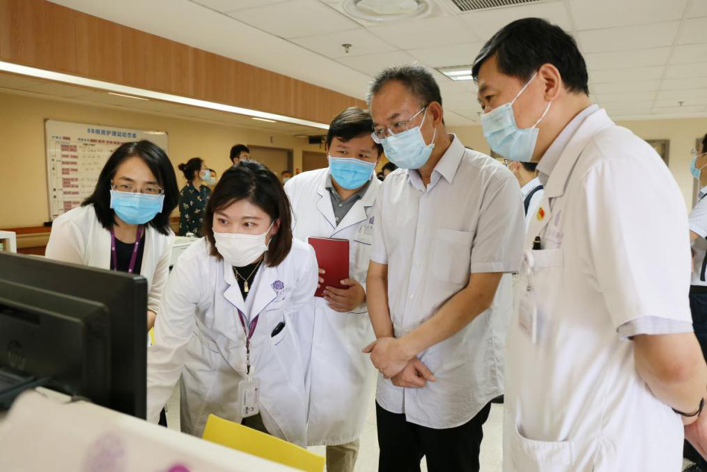 图为陈金甫副局长在病房实地考察医保结算系统操作流程