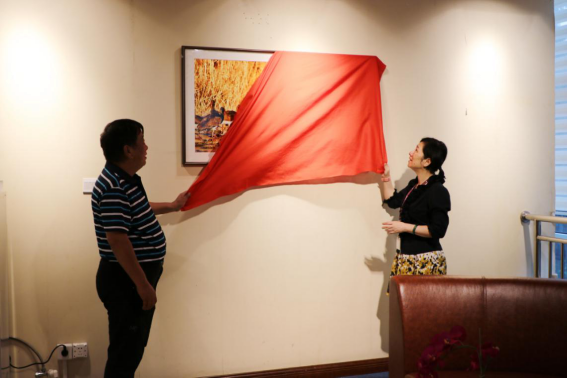 图为李振民先生与周碧琴总执行长共同为捐赠的摄影作品之一——国家一级保护濒危鸟类黒鹳揭幕(图/杨欣)