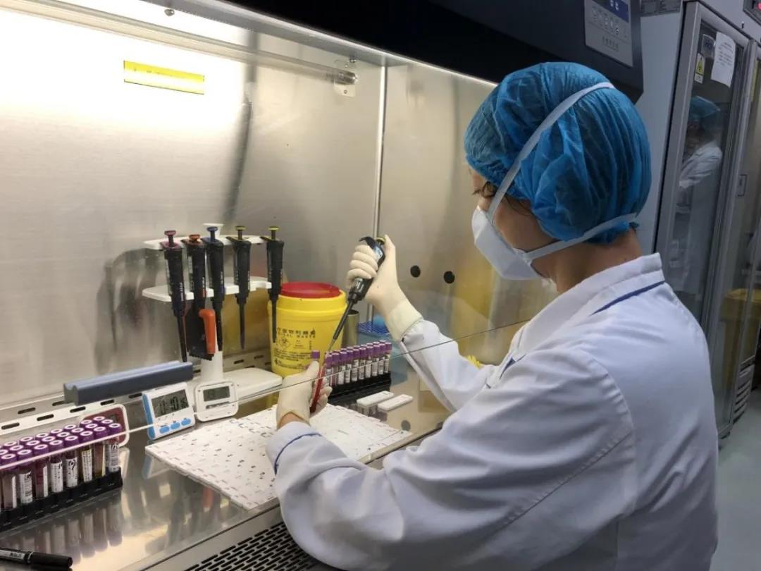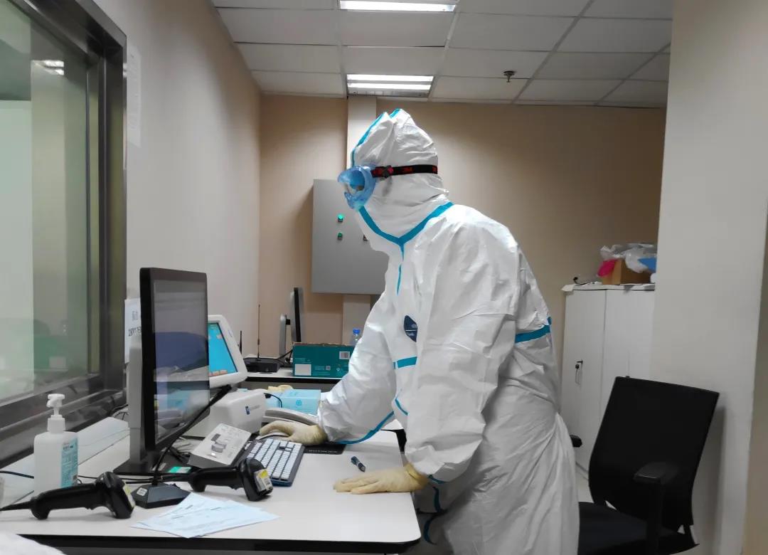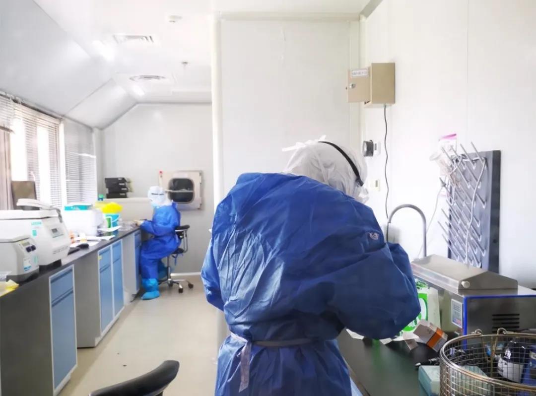 检验技师们在进行新冠核酸提取、新冠病毒血清检测,血、尿、便等样本也都是他们在忙活检验。