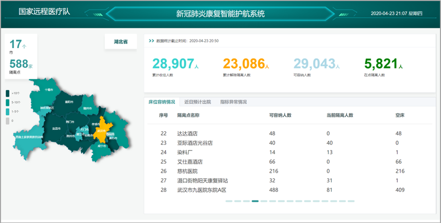 据悉,“新冠肺炎康复智能护航系统”自3月4日在武汉市武昌区正式上线,之后在湖北省全省市、区、县得到全面推广。截至4月3日,已接入覆盖17个市的533个隔离点,服务近2万名出院康复人员,所有入院患者无一例死亡,为康复患者管理提供了重要保障和支撑。