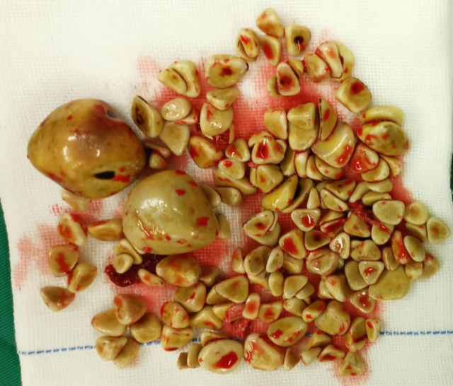 北京清华长庚医院9月16日电(通讯员 于悦超)近日,清华大学附属北京清华长庚医院肝胆胰外科进行了一例胆囊切除手术,切除胆囊剖开后,可见大大小小的黄色结石,足足有146颗,铺满了手术纱布。更为不幸的是,由于忽视这小小的结石,胆囊已发生癌变并转移。