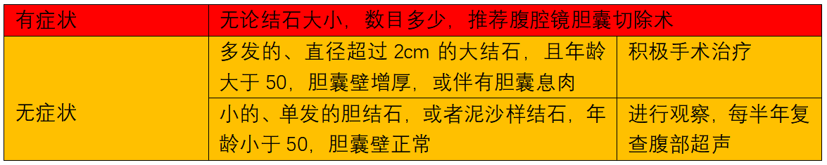 胆囊结石目前主要通过肝胆超声确诊,方便且无创。对于有症状与无症状的胆囊结石患者,可通过下表对不同的治疗方式进行梳理: