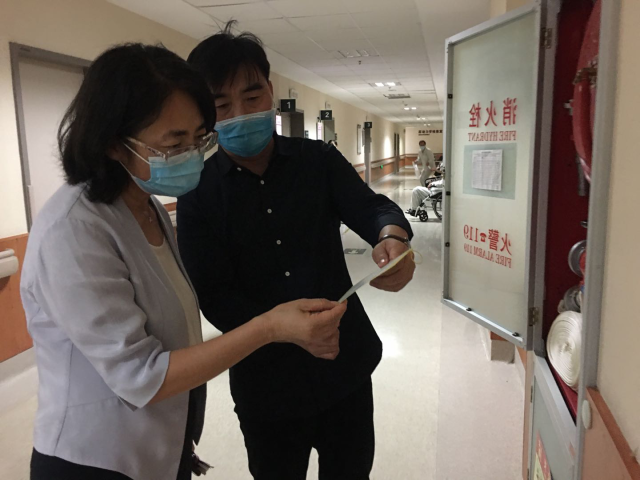 随后,检查组人员对1号楼急诊科进行检查,针对急诊空间小、病患多的问题,周月红表示要及时观察病患与家属情绪的变化,加强对急诊人员的安全保障。检查特需门诊时,因改造后产生交接问题,导致该区域安全执行人不明确,消防设施缺少,有未按规定检查的现象,周月红要求该区域尽快明确责任人,确保辖区安全。来到门诊大厅、放射治疗科等区域进行检查时,消防设备设施自检、自查工作比较到位,周月红对该区域的工作表示认可,并要求日后要继续保障安全工作的有序进行。