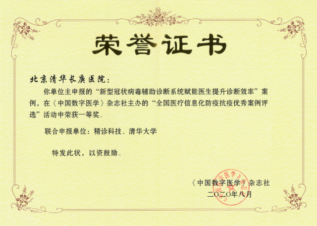北京清华长庚医院10月19日电(通讯员 信息管理部 张泽冉)由《中国数字医学》杂志社主办并启动评选,经资格初审、专家初评、专家终评,清华大学附属北京清华长庚医院董家鸿院士团队申报的“新型冠状病毒辅助诊断系统赋能医生提升诊断效率”案例在“全国医疗信息化防疫抗疫优秀案例评选”活动中荣获一等奖。
