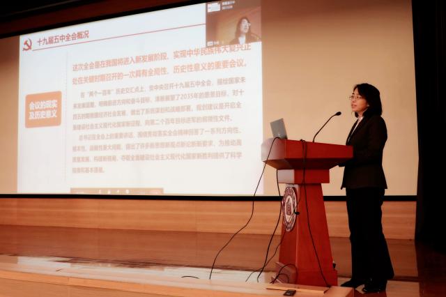 周月红指出,这次全会的召开具有全局性、历史性的重要意义,对“十四五”时期我国经济社会发展做出了系统谋划和战略部署,通过的《建议》是开启全面建设社会主义现代化国家新征程,向第二个百年目标进军的纲领性文件。周月红重点传达了决胜全面小康取得决定性成就、我国发展环境面临的深刻复杂变化、到2035年基本实现社会主义现代化的九大远景目标、全面推进健康中国建设的相关措施等内容,并从我国进入新发展阶段、贯彻新发展理念、构建新发展格局三个方面对《建议》进行了深入解读。