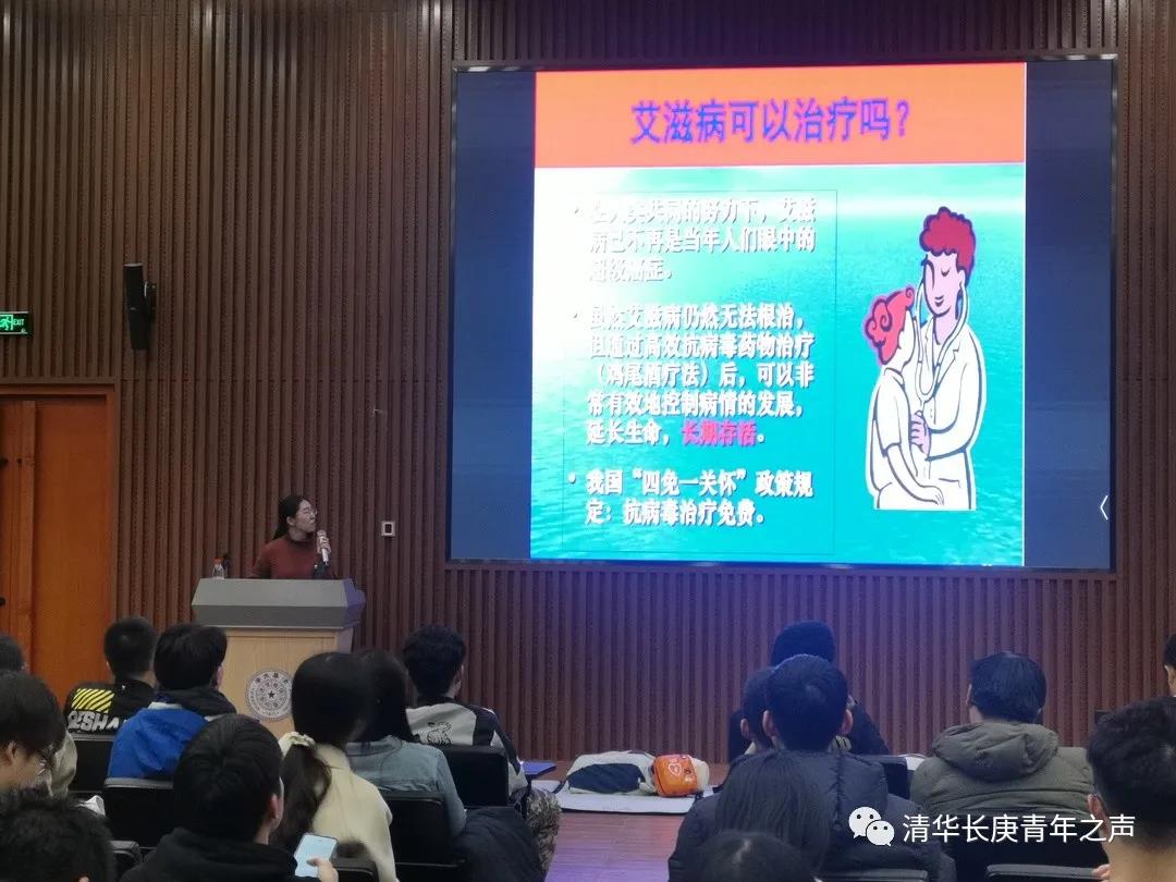 11月28日,恰逢北京清华长庚医院六周年院庆,我院青年志愿者代表皮肤科刘硕硕医师在清华大学南区学生活动中心为现场100余名学生带来一场生动的科普讲座。刘硕硕医师从艾滋病的定义、流行病特点、致病原因、传播途径、症状等方面逐层拨开其神秘面纱,通过图文结合的方式生动讲解艾滋病传染途径的认知误区,并提供实用信息,如“四免一怀”政策针对有经济困难的艾滋病患者给予免费检测、生活救济等方面的救助。现场部分同学表示,通过此次活动全面深刻地了解了艾滋病防治知识,希望有机会成为艾滋病防治科普志愿者,为推动此项工作贡献力量。