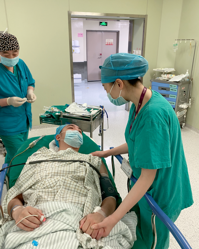 图为章薇医师在手术间鼓励麻醉前的小晨