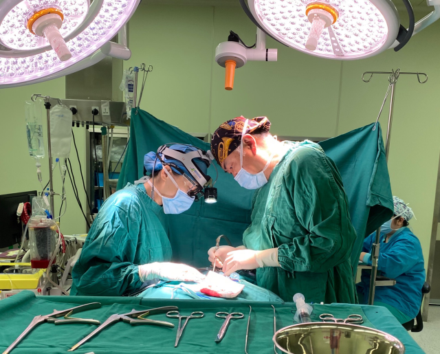 图为王劲副院长(右)、章薇医师(左)联合为患者手术