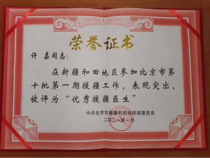 许嘉作为北京市委组织部第十批医疗援疆干部,对口支援新疆和田地区人民医院,在耳鼻喉科任职一年来,牢记使命,担当奉献,坚持每日教学查房,结合疑难病例指导临床工作,帮助当地一线医师建立系统和规范的临床思维,开展电子喉镜窄带成像技术,填补了当地的技术空白。前往墨玉县扎瓦乡、奎牙镇开展0-6岁儿童耳鼻喉科疾病的筛查工作,并通过实地操作手把手教学,把这一技术留在当地,助力和田地区医院全面开展新生儿AABR听力筛查。同时在当地开展小儿腺扁手术围手术期宣教,组织将清华长庚医院耳鼻咽喉头颈外科护理团队编写的相关材料翻译成维语派发给患儿家属,普及了相关医学知识,圆满完成了援疆各项任务。获得新疆和田地区人民医院“民族团结先进个人奖”、中共北京市援疆和田指挥部委员会“优秀援疆医生”等荣誉。