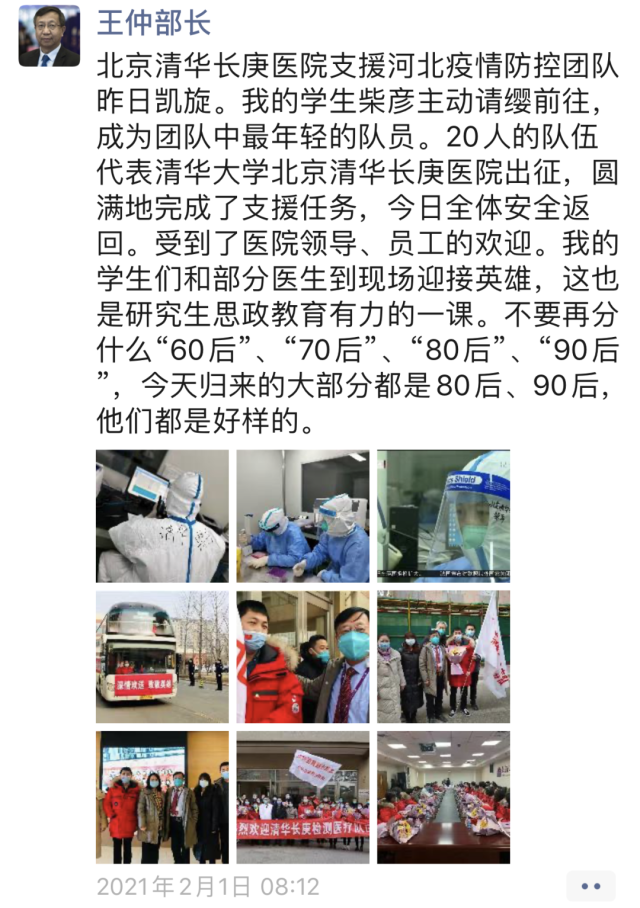 北京清华长庚医院2月10日电(通讯员 南子钰)题记:2021年1月10日,接到北京市卫生健康委、北京市医院管理中心通知,清华大学附属北京清华长庚医院组成20人核酸检测医疗队,开赴河北省三河市支援河北燕达医院新冠病毒检测工作。1月31日上午,他们结束了21天的支援任务,荣耀归来。队伍中的王利君和柴彦,他们还有另一层身份是清华大学在读的博士研究生。
