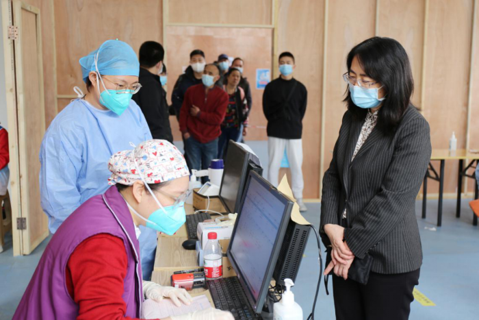 图为疫苗接种系统登记环节,党委书记周月红到现场调研(杨欣/摄)