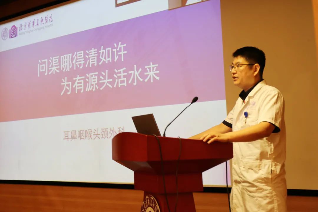 耳鼻咽喉头颈外科秦贺副主任医师作为优秀教学团队和优秀临床教学管理者代表发言,从教学课程设计、教学计划实施两方面分享了科室经验,展示了科室丰富的教学活动和成果。
