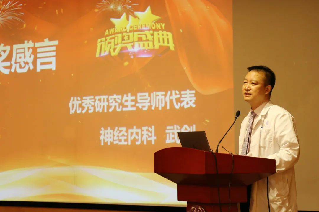 神经内科武剑主任作为优秀研究生导师代表发言,他向大家分享了科室在临床、教学、科研等方面的经验与取得的成绩,展示了科室发展的成果,并对教师与学生寄予希望,鼓励大家继续努力。