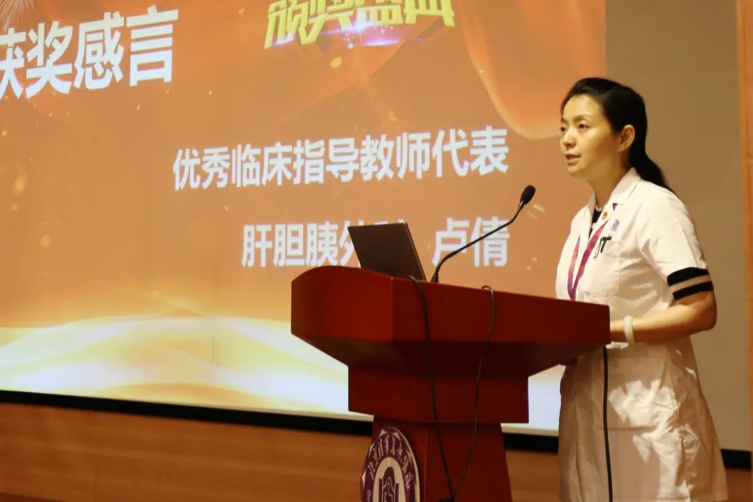 院长助理、肝胆胰外科执行主任卢倩作为优秀临床指导教师代表发言,她提到临床教学根植于临床,在把技能教授给学生的同时,也要注重医德、医风的传授,教师是指路人也是掌灯人,鼓励学生们要志存高远,脚踏实地实现理想。
