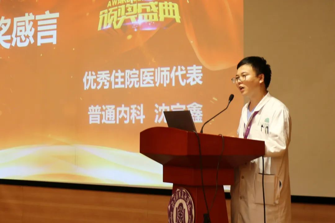 普通内科沈宇鑫代表优秀住院医师发言,回顾和分享了自己在新冠疫情防控工作与在住院医师培训过程中的成长和体会,感谢科室丰富的教学活动和老师孜孜不倦的教诲对自己成长的帮助。
