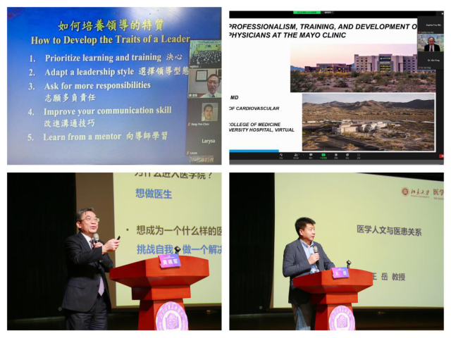 会议首先邀请著名颌面整形外科学家、台湾长庚纪念医院决策委员会名誉主委陈昱瑞教授带来“医师领导者的风范”主题演讲,陈主委从医师角色、领导者的特质,以及医师领导者所应展现的风范多维度讲授如何塑造医师领导者。国际著名心脏病专家,曾长期担任美国梅奥诊所Arizona心脏中心主任的沈文光教授在美国远程连线,讲授梅奥医师的职业规范和医师素养培训,为清华医师职业素养的养成提供借鉴。著名血液病学家国家血液系统疾病临床医学研究中心主任、北京大学血液病研究所所长黄晓军教授分享了如何做一名好医生,从知识学习、能力提升、全局与担当三个维度分享了卓越医师的成长之路。北京大学医学人文学院副院长王岳教授用一系列生动的照片和视频,深入浅出地对新形势下的医患关系、医学人文精神、职业信仰等进行了深刻解读,从医学人文视角重新阐释医患关系和医学人文精神在医疗服务、构建和谐医患关系中的重要作用。