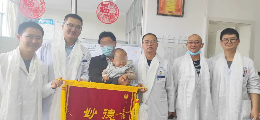 图为达嘎巴珠出院时,患儿家属为靳松医师(左二)