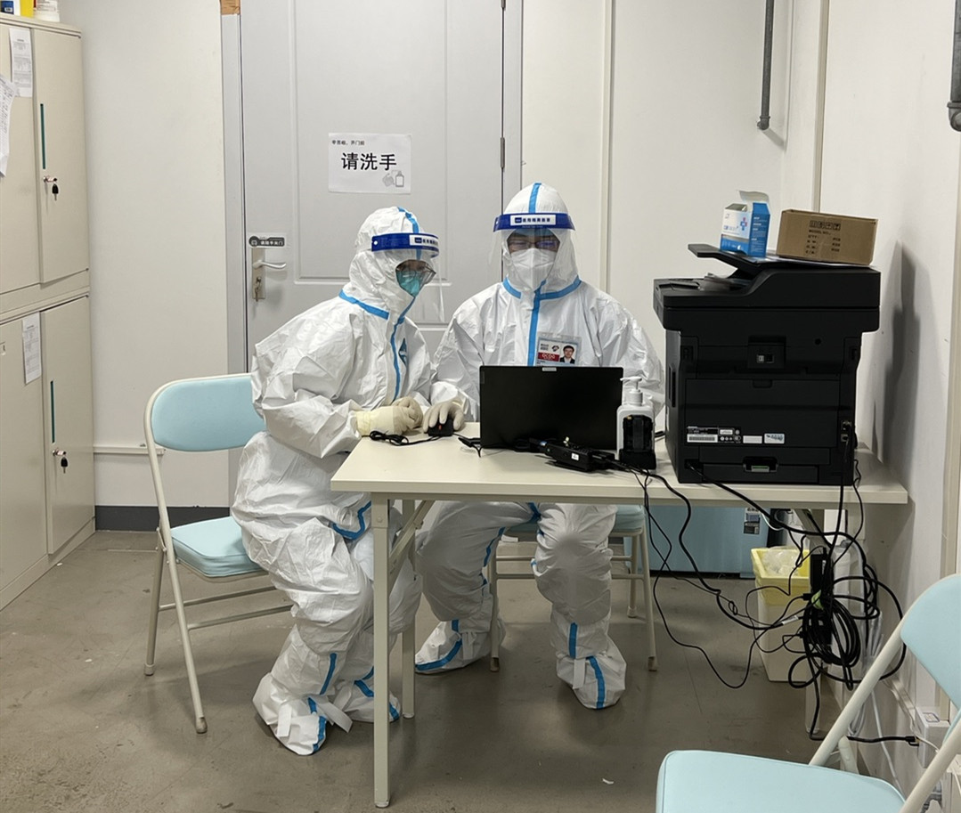在全球新冠疫情蔓延持续的形势下,场馆的疫情防控工作面临严峻考验。为此,赛前保障团队多次在场馆开展发热应急预案演练,赛时全体队员实施分区闭环管理,闭环内外人员不交叉,减少人员流动,降低感染风险。同时,医疗保障队积极协助场馆落实防疫工作,严把疫情防控关卡,通过“体温贴”等落实体温实时监测,做好二级防护,执行并监督工作区域消杀工作,保障场馆安全顺利运行。