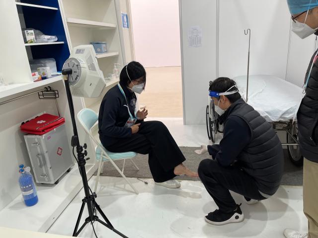 冰立方是唯一承办北京冬奥会“相约北京”系列测试赛中冬残奥会项目赛事的场馆。为国内测试活动提供医疗保障的同时,医疗保障团队还针对轮椅冰壶锦标赛的特殊性,坚持“观念无障碍、信息无障碍、硬件设施无障碍、服务无障碍”原则,体现人文关怀,专门配备辅具医生,为各国参赛队员提供轮椅维修等服务和假肢维护服务;充分考虑参赛人员身体条件限制和日常活动特点和细节,设置可调节高度诊床,专门加宽体温检测门;队员们专门进行现场演练,模仿轮椅运动员的高度标准设置,确保运动员在取用防疫物资时高度合适,伸手可及。