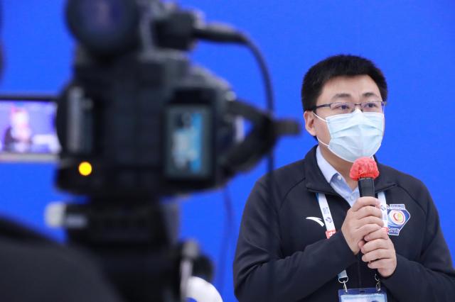 吴巍巍接受新闻发布会采访(国家游泳中心/摄)