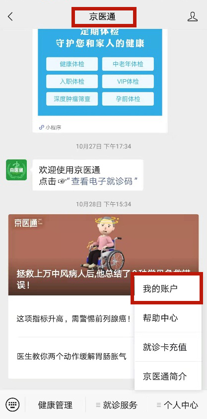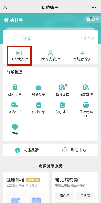 手机:微信关注京医通公众号注册成功后,在个人中心→我的账户→电子就诊码→完善个人信息并完成人脸识别后获得本人电子就诊码;