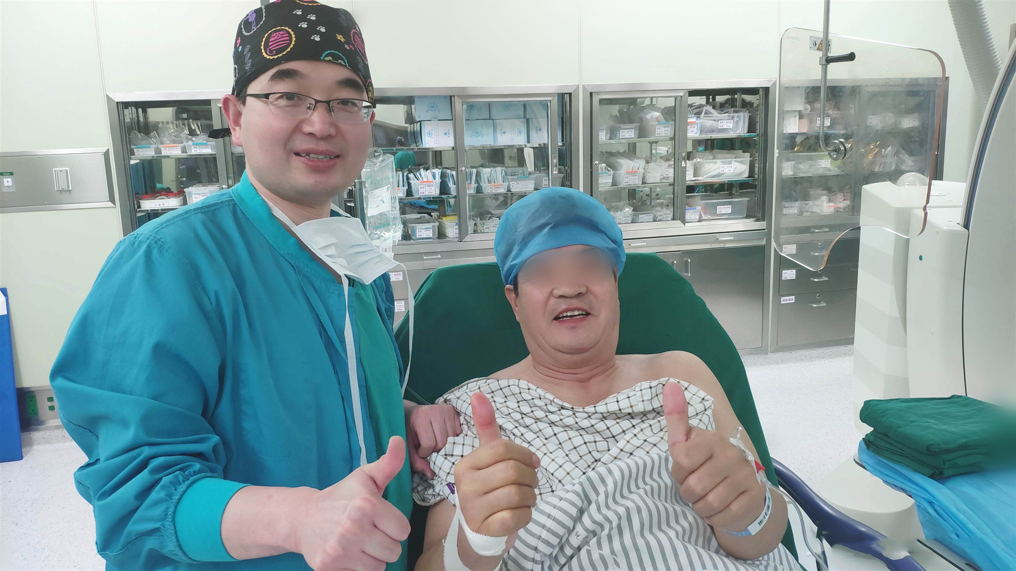 薛亚军与患者共同比出“胜利”手势