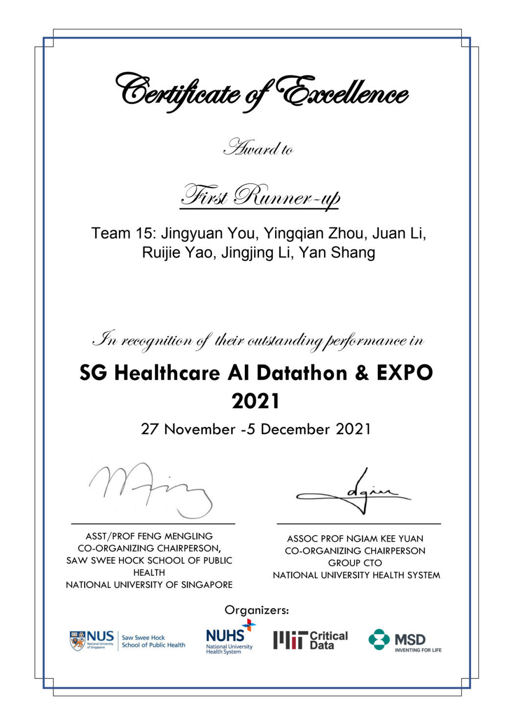 “医疗AI数据马拉松”自2018年起已成功举办三届,收到了来自NUHS、NUS、工业界、医疗保健行业、学术团体和其他机构的热烈响应。本届大赛,共有78支参赛队伍入围初赛,48支队伍晋级决赛,分别来自中国、日本、韩国、泰国、澳大利亚和巴西等国家的10余家研究机构。决赛邀请到来自麻省理工学院、哈佛大学、康奈尔大学、埃默里大学、新加坡国立大学等国际院校的20名专家担任导师、评委。经过激烈角逐,北京清华长庚医院推荐的由清华大学理工院系与心脏内科、呼吸与危重症医学科、皮肤科和耳鼻喉头颈外科临床医师组成4支队伍中,耳鼻喉头颈外科代表队最终在48支决赛队伍中排名第2,获得“First Runner-up”亚军荣誉。