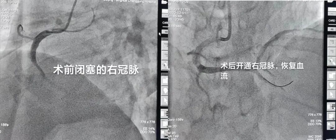 接诊的宋开元医生立马完成心电图检查,明确诊断为急性右室下壁心肌梗死。时间就是生命,时间就是心肌。然而患者此时没有直系亲属,行政总值班果断签字抢救,立刻启动胸痛中心急性心肌梗死救治“绿色通道”!内科二线高博医生,心脏内科三线佘飞医师已经同时赶到急诊参与救治,与此同时通知心脏介入备班医师薛亚军、耿雨到位。患者完成核酸检测及肺部CT后,导管室已一切准备完毕,患者直接转入进行介入手术。术中医生从梗塞的右冠脉内抽取出大量血栓,冠脉恢复血流再灌注,患者转危为安,返回心脏重症监护室。从接诊赵大叔到冠脉血管开通,不到60分钟。