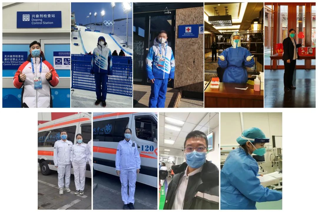 奔赴张家口云顶滑雪公园医疗英语志愿、北京颁奖广场兴奋剂检测、防疫联络与120院前急救的队员们