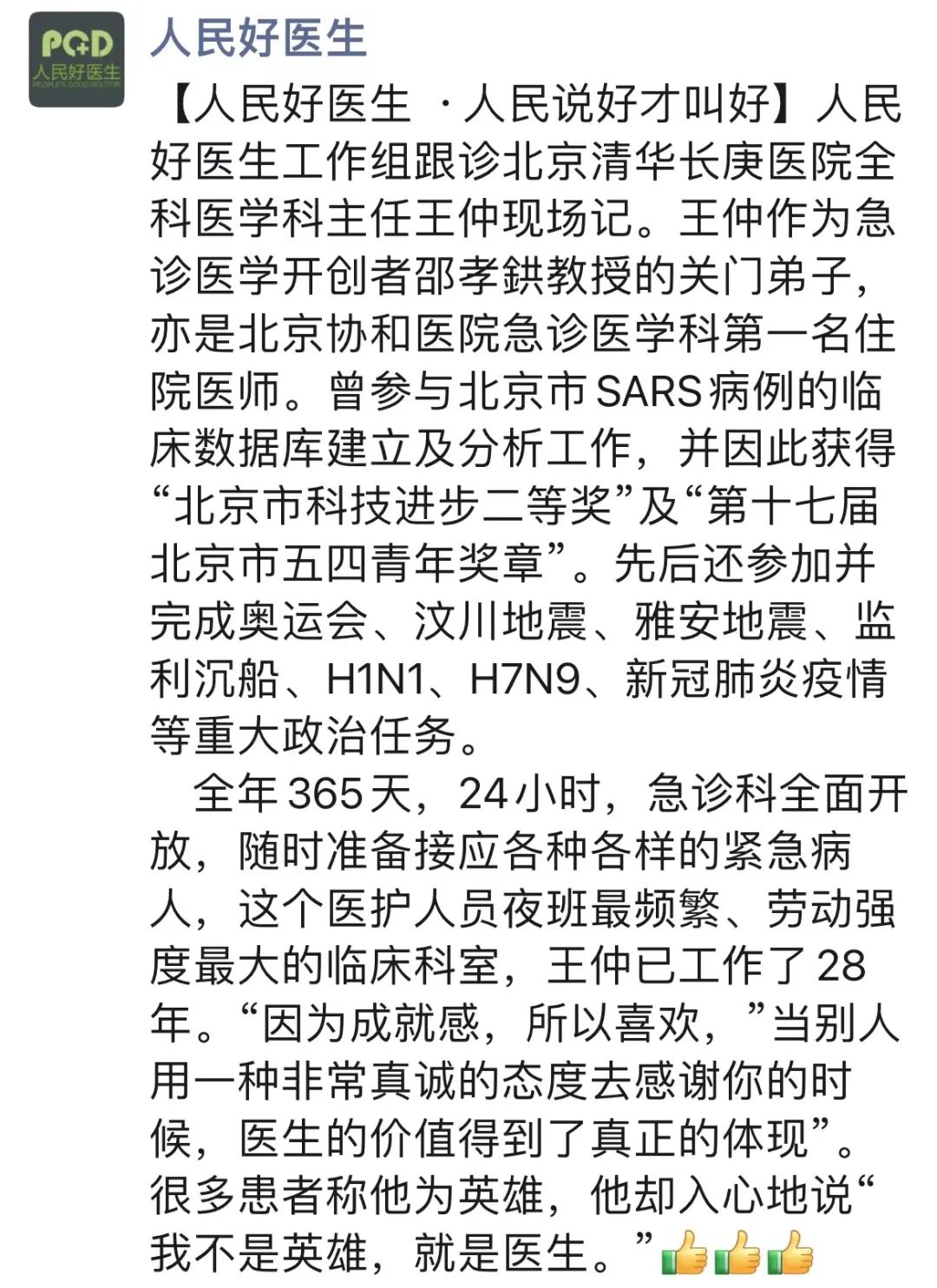 非典之外,北京奥运会、汶川地震、监利沉船、H1N1、H7N9、新冠疫情等等,王仲带领着他的团队打了一次又一次的胜仗,像一位冲锋陷阵的将军。