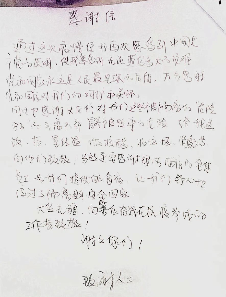 一位隔离人员在解除隔离时为队员们留下感谢信,真情满满