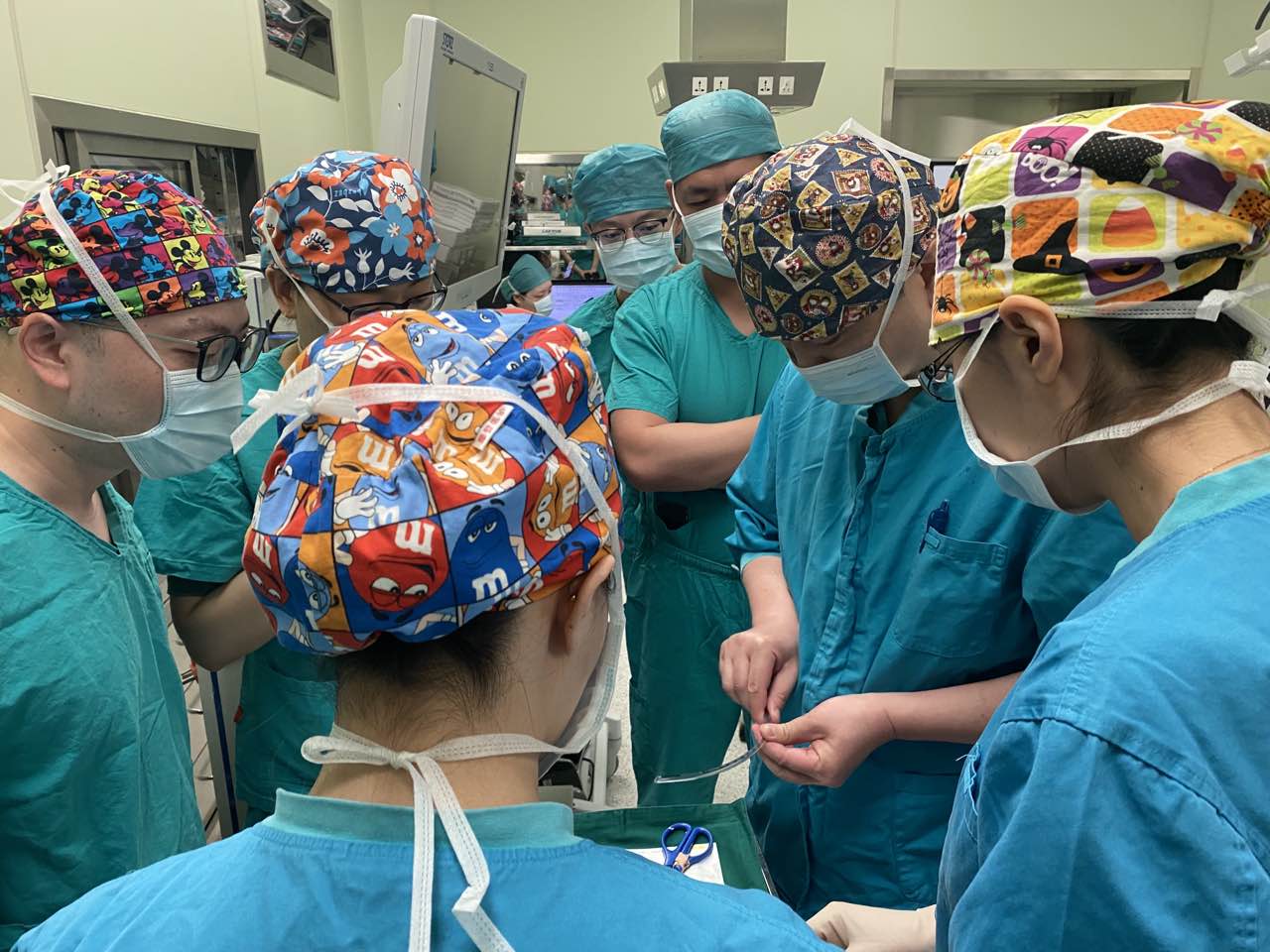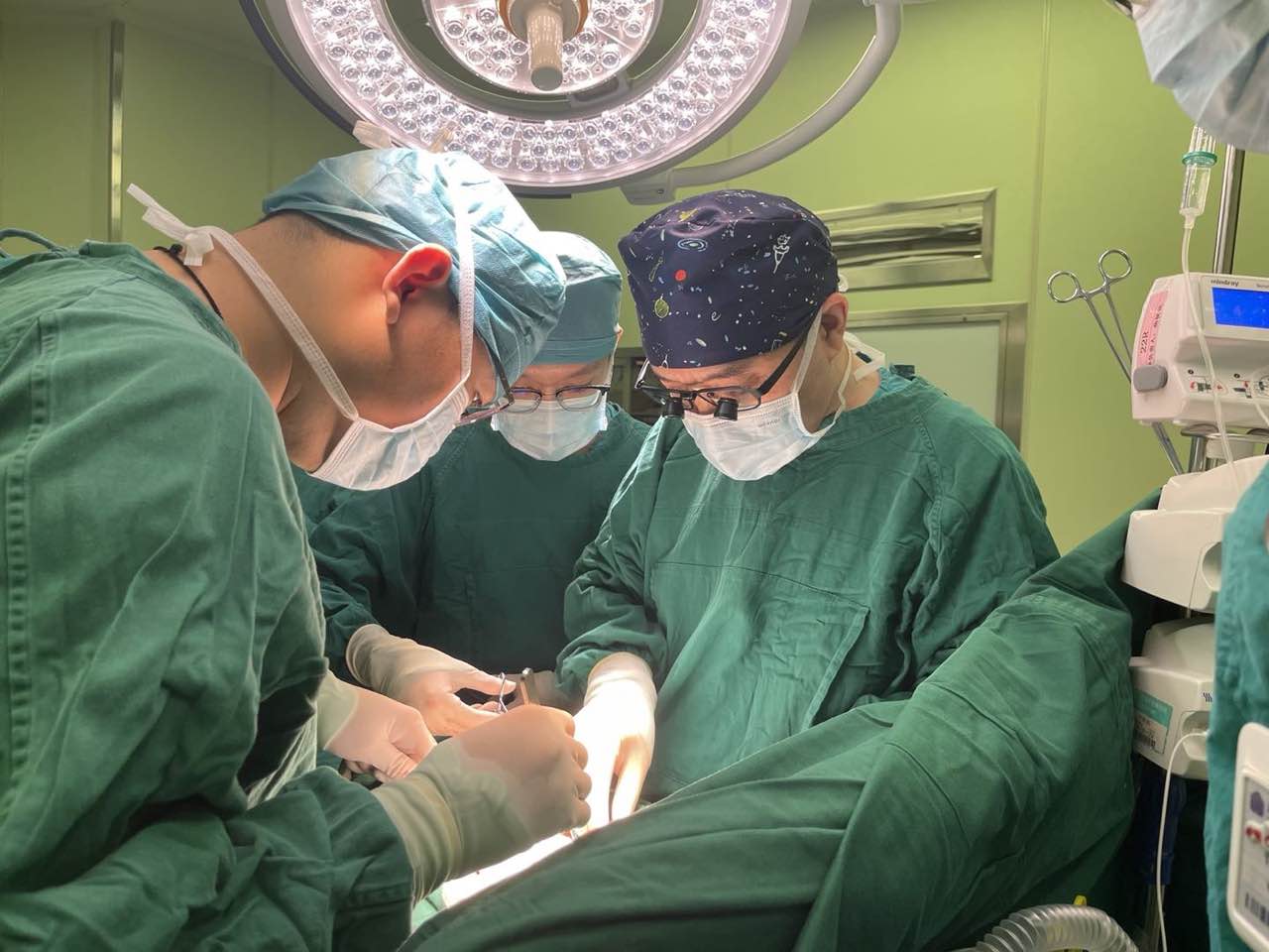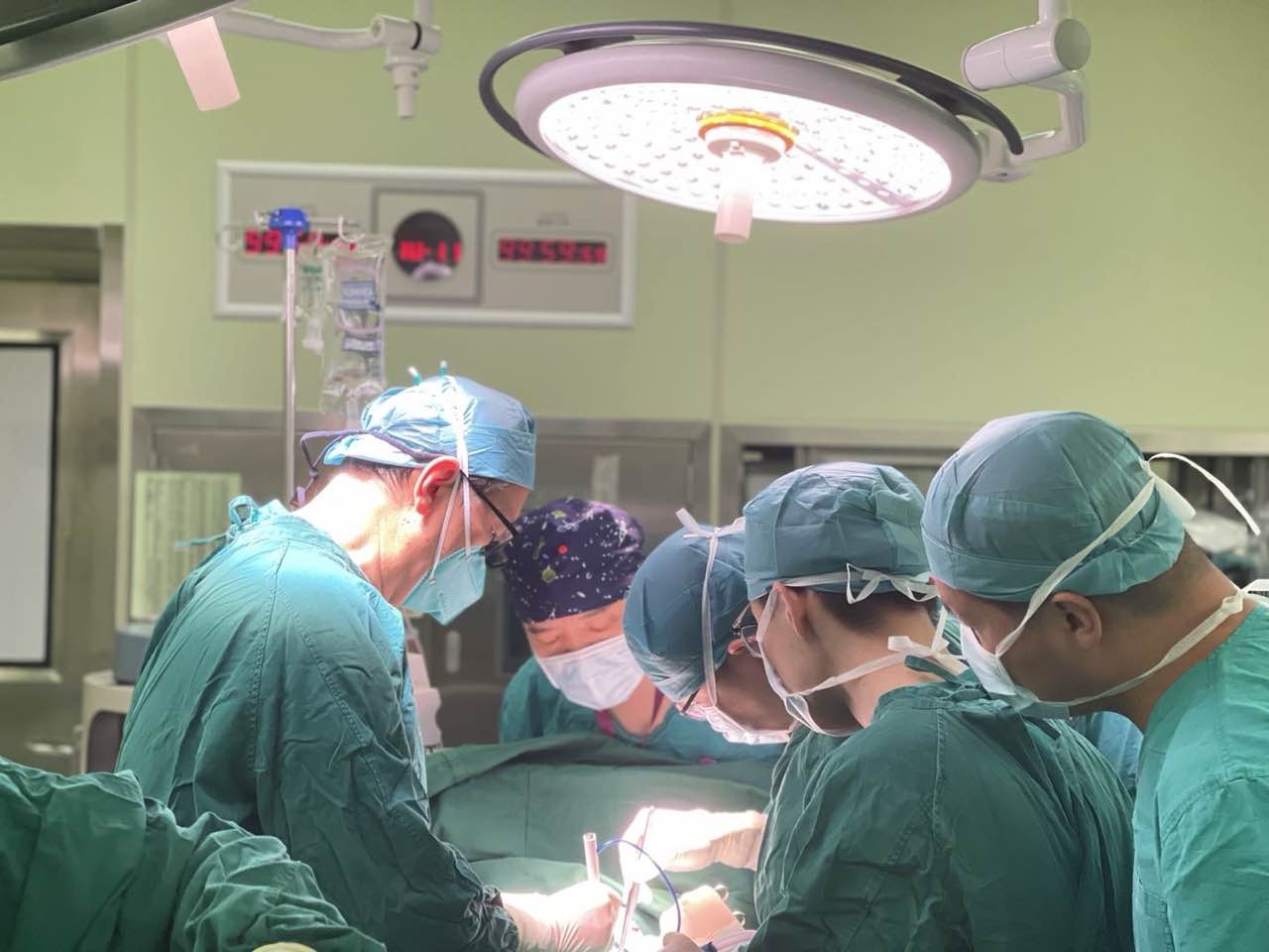 完成人工气道建立后,普外科主任罗斌首先分离位于颈根部的肿瘤,仔细解剖、游离肿瘤上端,保护甲状腺及周围血管不受损害。陈东红随后正中开胸,解剖、显露肿瘤的中下段,仔细将肿瘤与右侧头臂干动脉和气管分离,同时修补因肿瘤压迫造成的气管损伤。