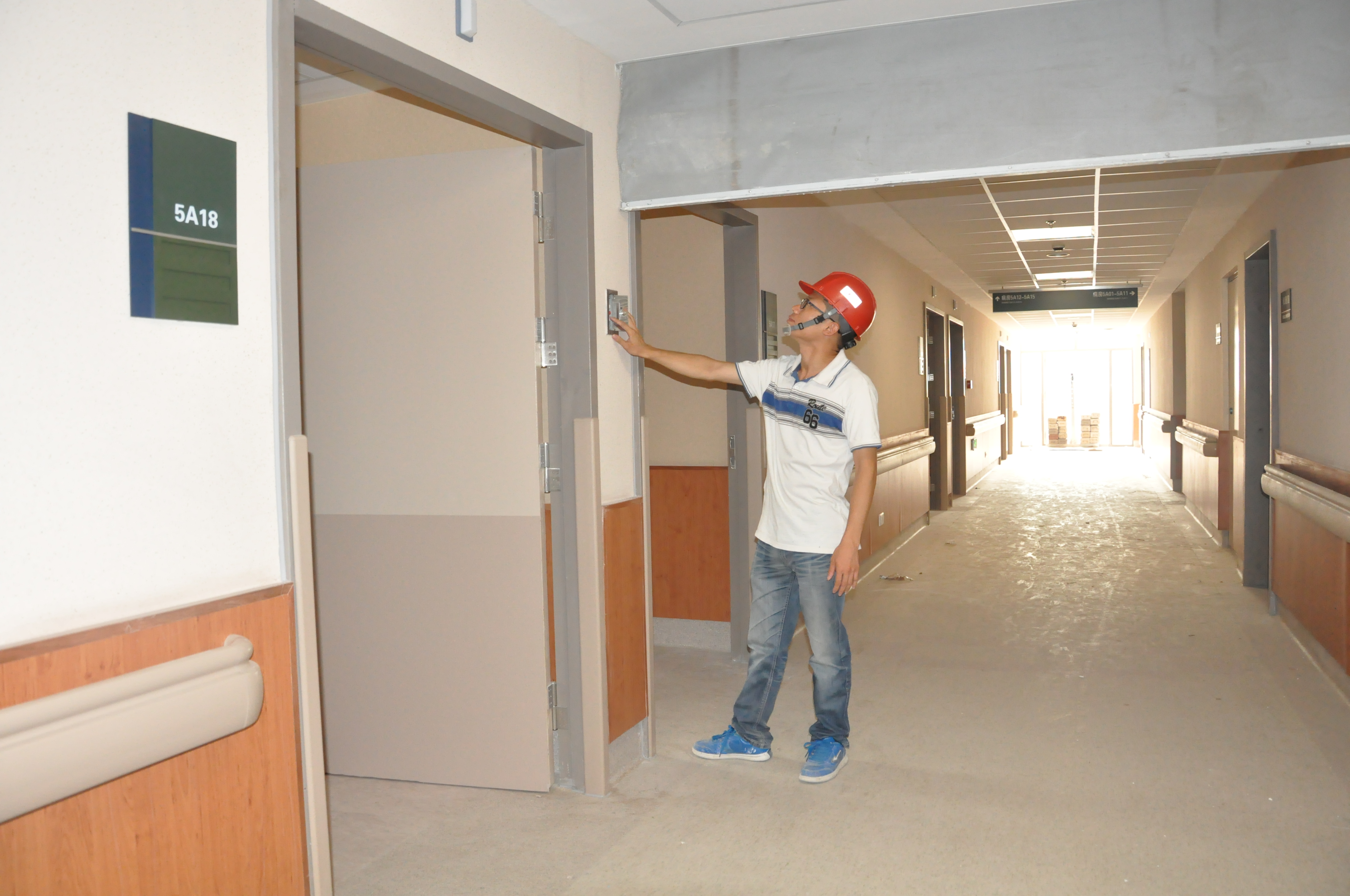 图为工程人员正在测试病房走道的挡烟垂壁,该设施用于隔断烟雾流通