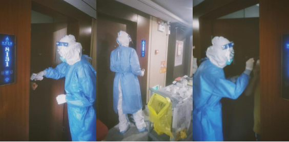 除了走廊,楼梯也是留下最多汗水的地方。接收或送出隔离人员需要做到和社区“手递手”完成交接,医务人员全程陪同完成文件签署、相关检测、告知书发放等工作,直至送到房间或送出隔离点。“穿着防护服爬楼梯真的是考验。不过有了一起爬楼梯的经历,隔离人员对我们也有了更多共情。”季午阳感慨着,“一位大哥不停地说着谢谢,走时还祝福我们工作生活顺利,心里很温暖。”