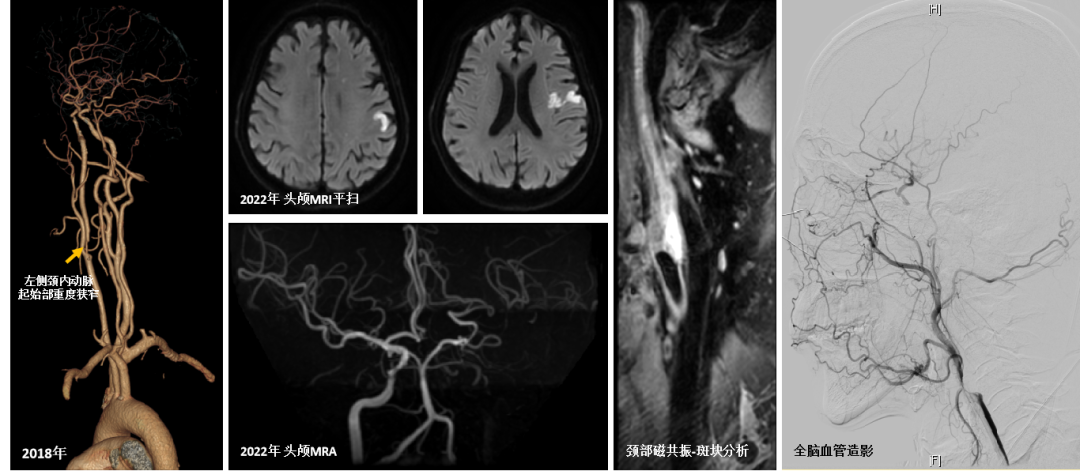2018年头颈CTA示左侧颈内动脉起始部重度狭窄/2022年3月头颅MRI显示左侧颈内动脉供血区多发脑栓塞病灶,头颅MRA可见左侧颈内动脉全程闭塞,全脑血管造影可见左侧颈内动脉闭塞
