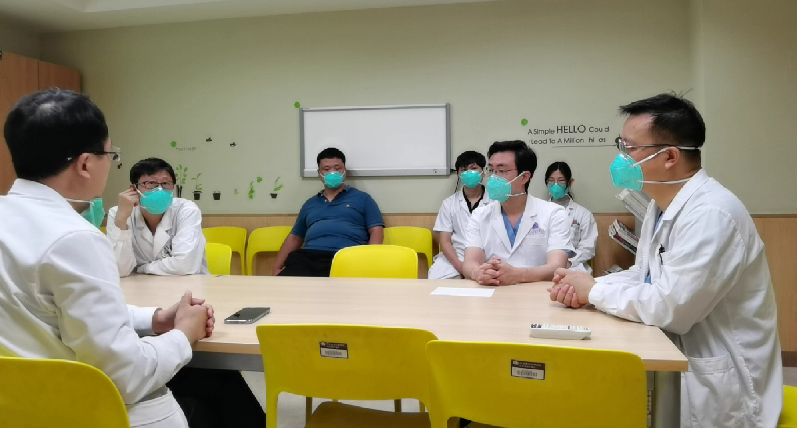 武剑同张小峰、郭毅、苏伟床旁查看患者,并组织神经中心联合术前讨论