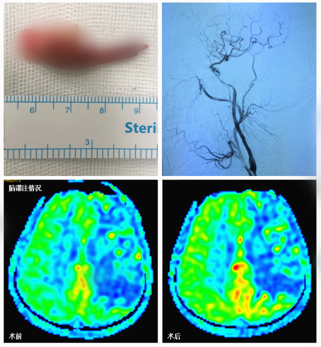 神经外科医师完成颈动脉内膜剥脱,后介入团队继续开通剩余血管,复查造影颈内动脉血流恢复通畅,术后复查头颅影像学提示左侧大脑半球灌注比术前改善