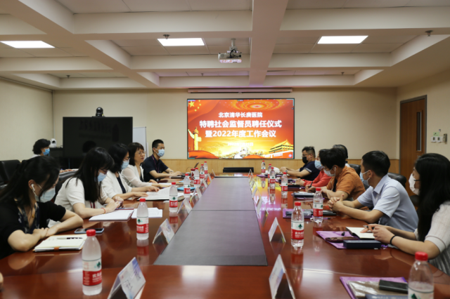 北京清华长庚医院7月22日电(通讯员 李振华) 为进一步加强主动治理、提升监督合力,7月21日北京清华长庚医院召开特聘社会监督员聘任仪式暨2022年度工作会议。医院首次聘任11位特聘社会监督员通过线下线上相结合的方式参加会议,院党委书记周月红、党委副书记兼纪委书记王克霞、行政总助柳玉倩以及纪检办、法务部、社服部、宣传中心等负责人现场参会。会议由王克霞主持。