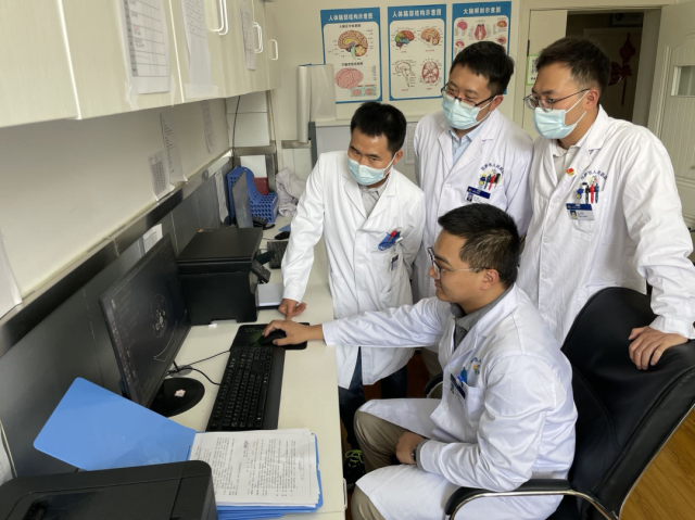 靳松(左二)带领科室医生研究影像