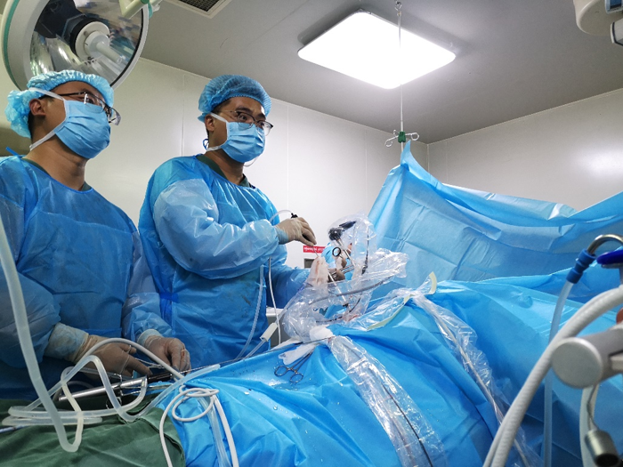 靳松(右)完成标准通道经皮肾镜手术
