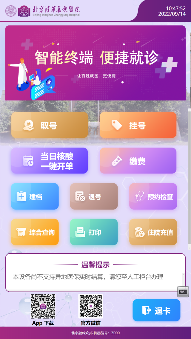 北京清华长庚医院9月14日电(通讯员 胡婉秋 李广)响应北京市医院管理中心关于做好服务品质提升工作,为患者提供更加优质、便捷、满意的医疗服务,9月起,北京清华长庚医院新增门诊自助服务设备,推出新版大屏自助一体机,共80台设备将陆续上线,摆放在我院门诊、急诊、住院各区域。