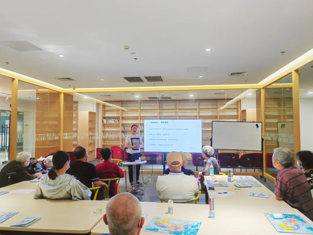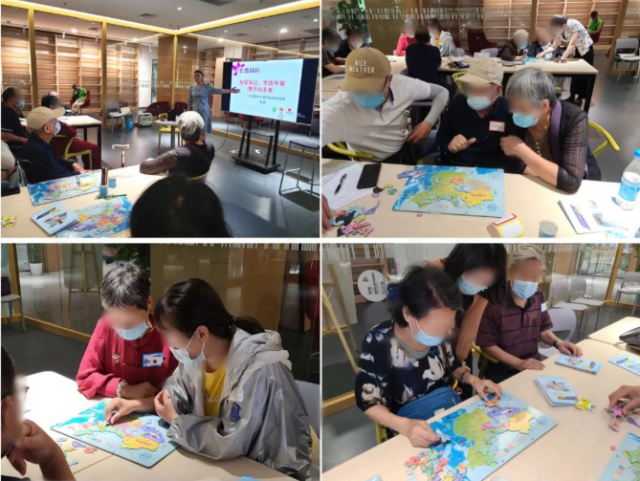 首先,神经内科副主任医师张菁就阿尔茨海默病的防治进行科普讲座,对疾病特征及相关预防知识进行讲解与交流,为病友与家属解疑答惑,并强调了持续接受药物治疗与非药物治疗的必要性。随后,在社工带领下,老人们参与到“手指操”中训练上身活动及手指运动能力、而在“大好河山”环节,社工引导老人们对家乡的景点、美食进行联想,并在家人帮助下完成地图拼图探索,充分调动手脑协同与家庭支持完成认知训练。
