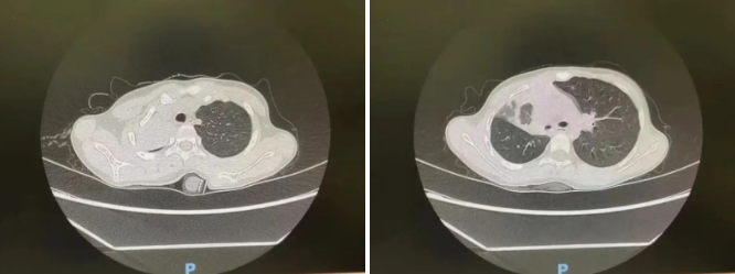 左:支气管镜术后复查床旁胸片显示病变较前明显好转,纵隔及气管较前复位