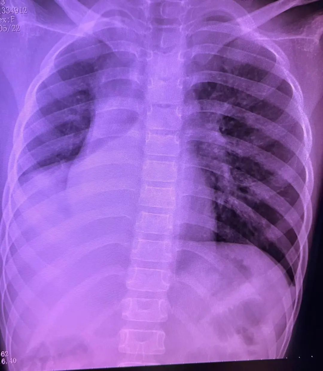 入院次日,患儿的指尖血氧饱和度下降至88%左右,心率最高135次/分。体格检查显示患儿精神差,咳痰无力,右侧胸廓塌陷,呼吸动度消失,右肺叩实音,右肺呼吸音几乎完全消失。