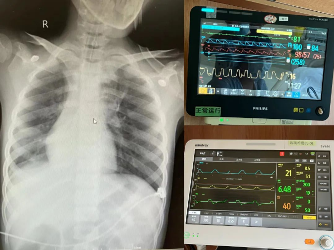右:监护室中监护仪显示患者氧合100%,呼吸频率下16次/分,气道峰压21mmHg
