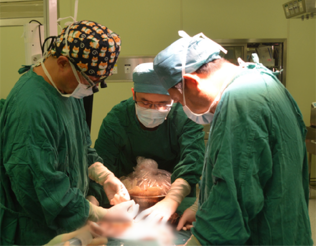 李元新(左一)、朱志东(右一)、朱长真(中)进行手术